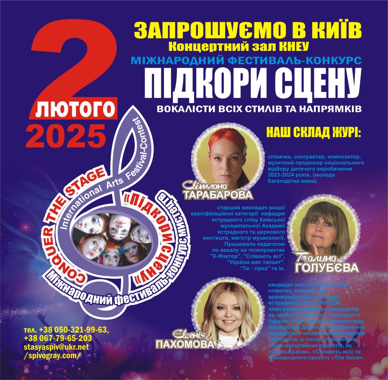 Міжнародний фестиваль-конкурс "Підкори сцену" Традиційний фестиваль з багатою історією чекає на тебе! 💕Що ми пропонуємо: ✅Чудова сцена, якісне світло та звук ✅Чітка програма виступів ✅Чудові призи та спеціальні нагороди ✅Супер журі оцінить твої таланти ✅Гарні умови для учасників ✅Дотримання всіх безпекових норм 🫶Коли: * 1 лютого - хореографія * 2 лютого - вокал 🤝Де: Київ, Концертний зал КНЕУ