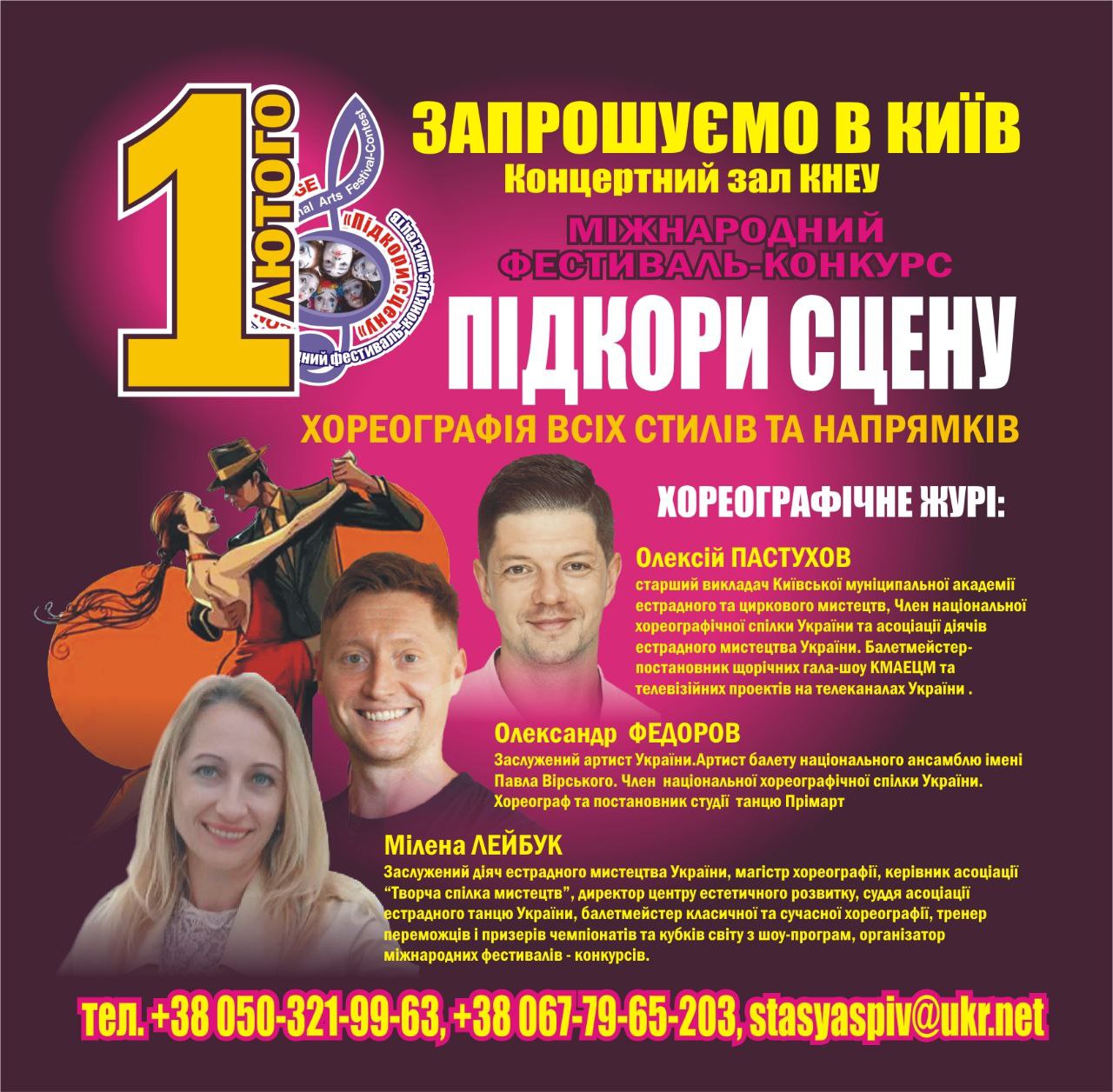 Міжнародний фестиваль-конкурс "Підкори сцену" Традиційний фестиваль з багатою історією чекає на тебе! 💕Що ми пропонуємо: ✅Чудова сцена, якісне світло та звук ✅Чітка програма виступів ✅Чудові призи та спеціальні нагороди ✅Супер журі оцінить твої таланти ✅Гарні умови для учасників ✅Дотримання всіх безпекових норм 🫶Коли: * 1 лютого - хореографія * 2 лютого - вокал 🤝Де: Київ, Концертний зал КНЕУ