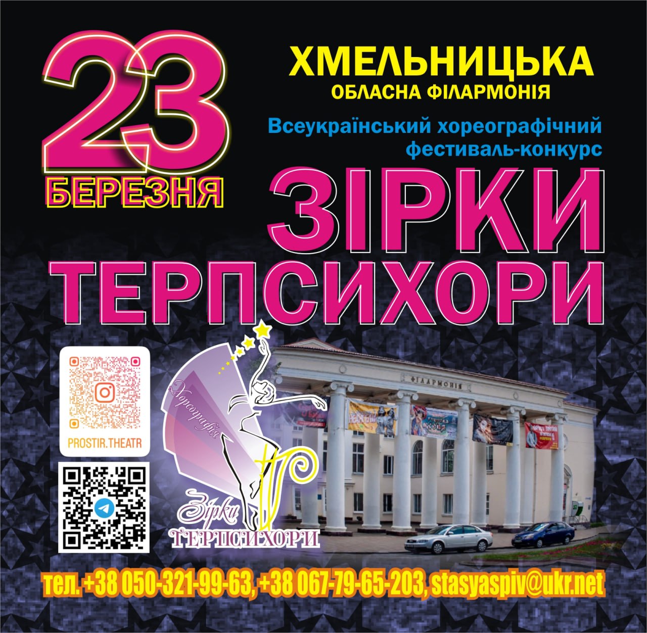 Всеукраїнський хореографічний фестиваль-конкурс «Зірки Терпсихори» Зірковий член журі Амадор Лопес ! Організатор Громадська організація «ДГОСпівограй» Терміни проведення: 23 березня 2025 р. Місце проведення: Хмельницька обласна філармонія Адреса: 29000, м. Хмельницький, вул. Героїв Маріуполя, 7 (розміри сцени 11 на 11,покриття дерево) - дипломи учасника «ЗіркиТерпсихори»; Для учасників - подячні листи для керівників колективів та спонсорів; - сертифікати про проходження майстер-класів; - дипломи лауреатів 1, 2, 3 ступеня, а також дипломи «Гран-прі»; - кубки, призи, пам'ятні подарунки. Переможці отримують запрошення на Міжнародні фестивалі Гран-Прі отримує грошову винагороду Вас чекає майстер клас від члена журі Бориса Бунь з народної хореографії .